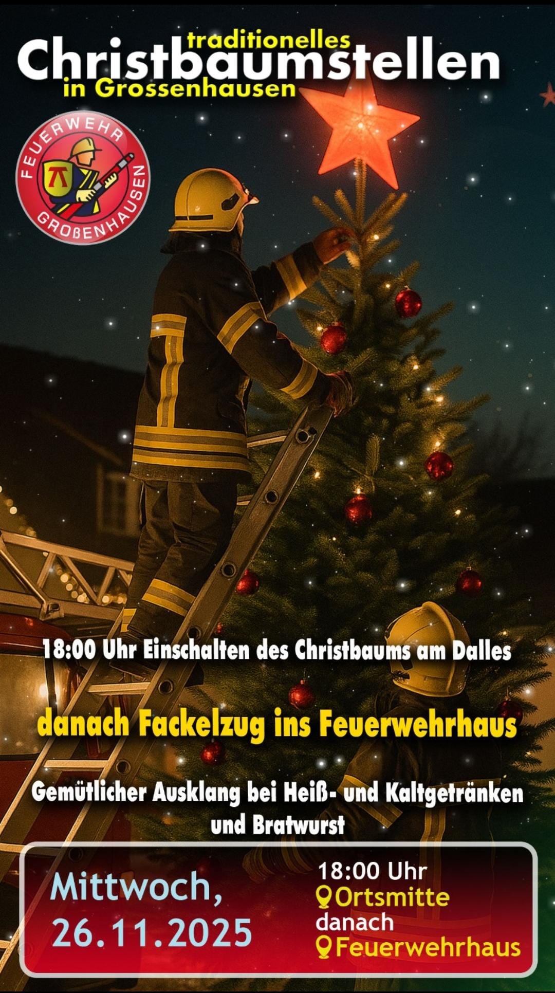 Um 18 Uhr schaltet die Feuerwehr Großenhausen am Dalles die Beleuchtung des Chrstbaums ein.